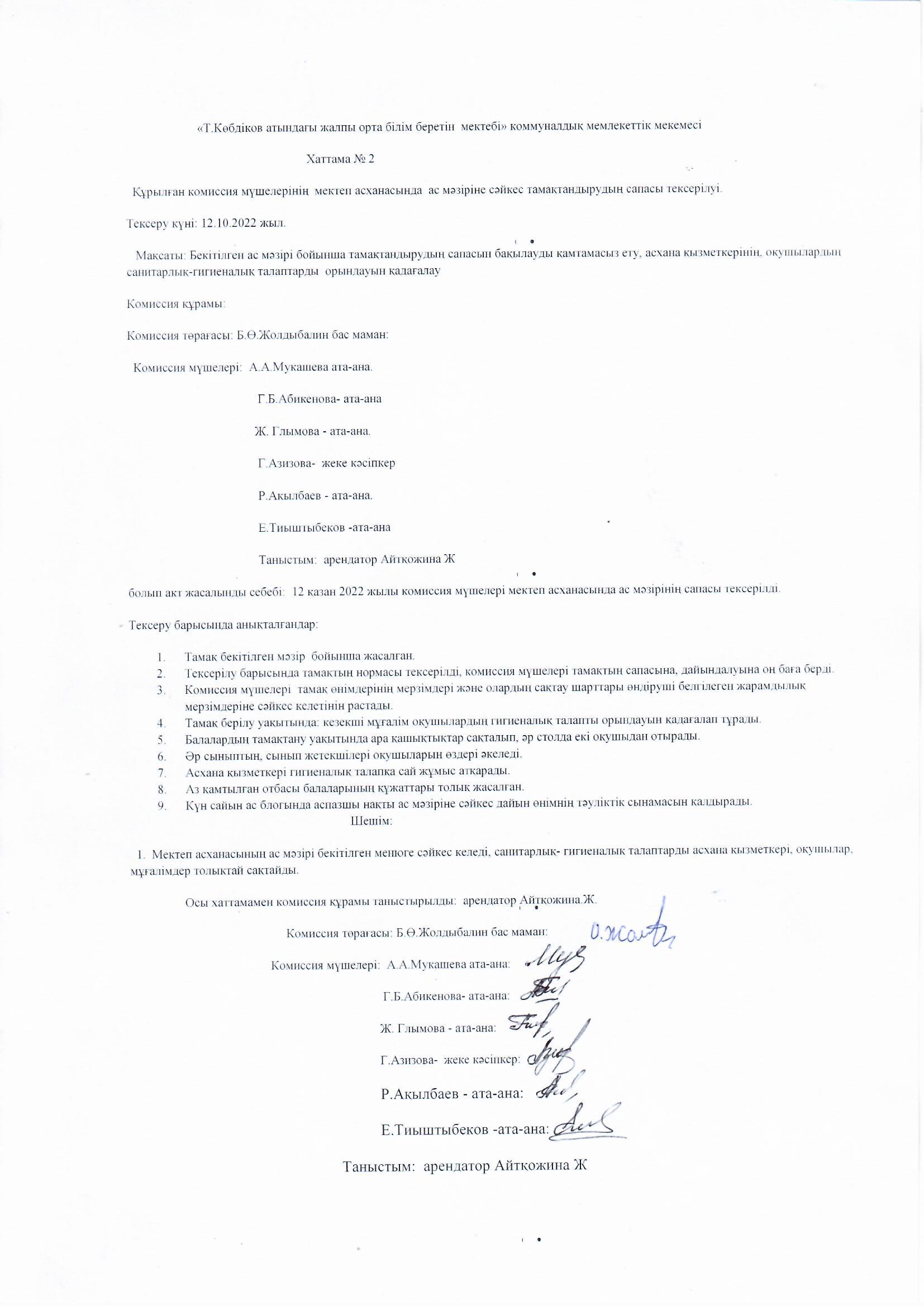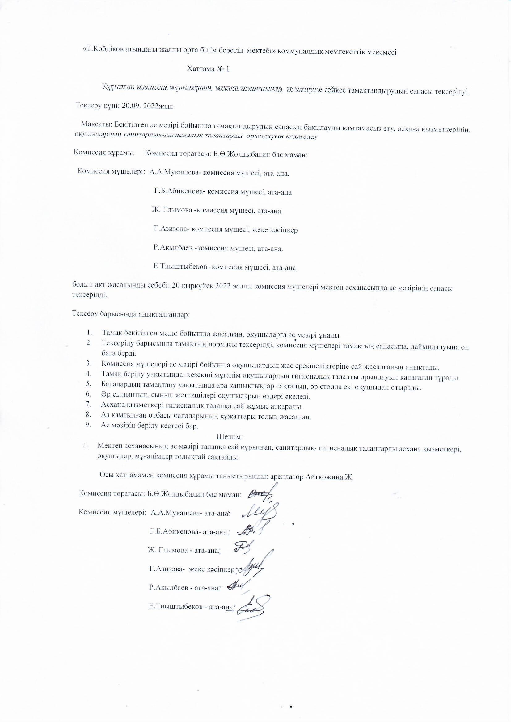 Комиссия мүшелерінің тамақтың сапасын тексеруі туралы хаттама