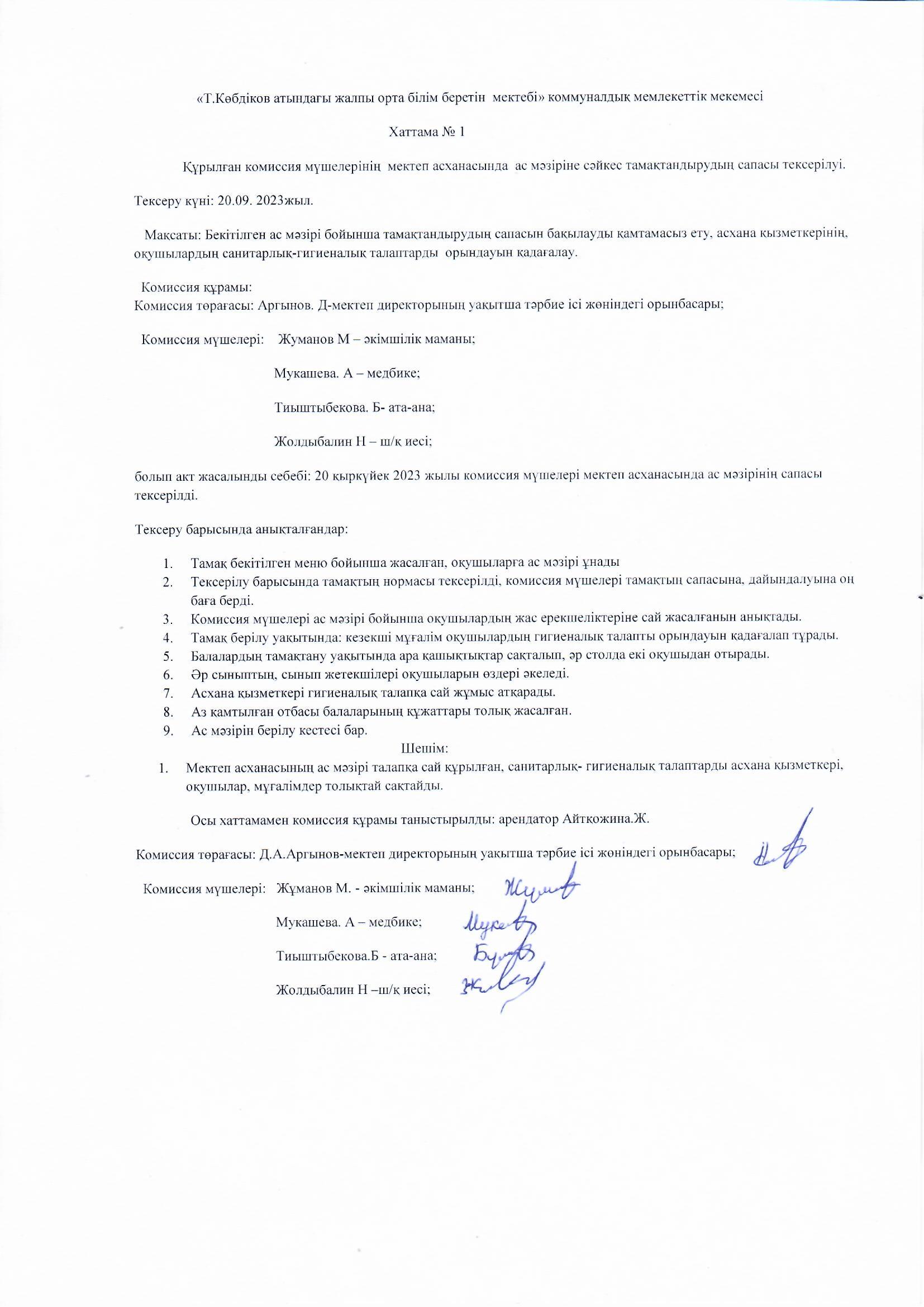 » Мектеп асханасында ас мәзіріне сәйкес тамақтандырудың сапасы туралы хаттама