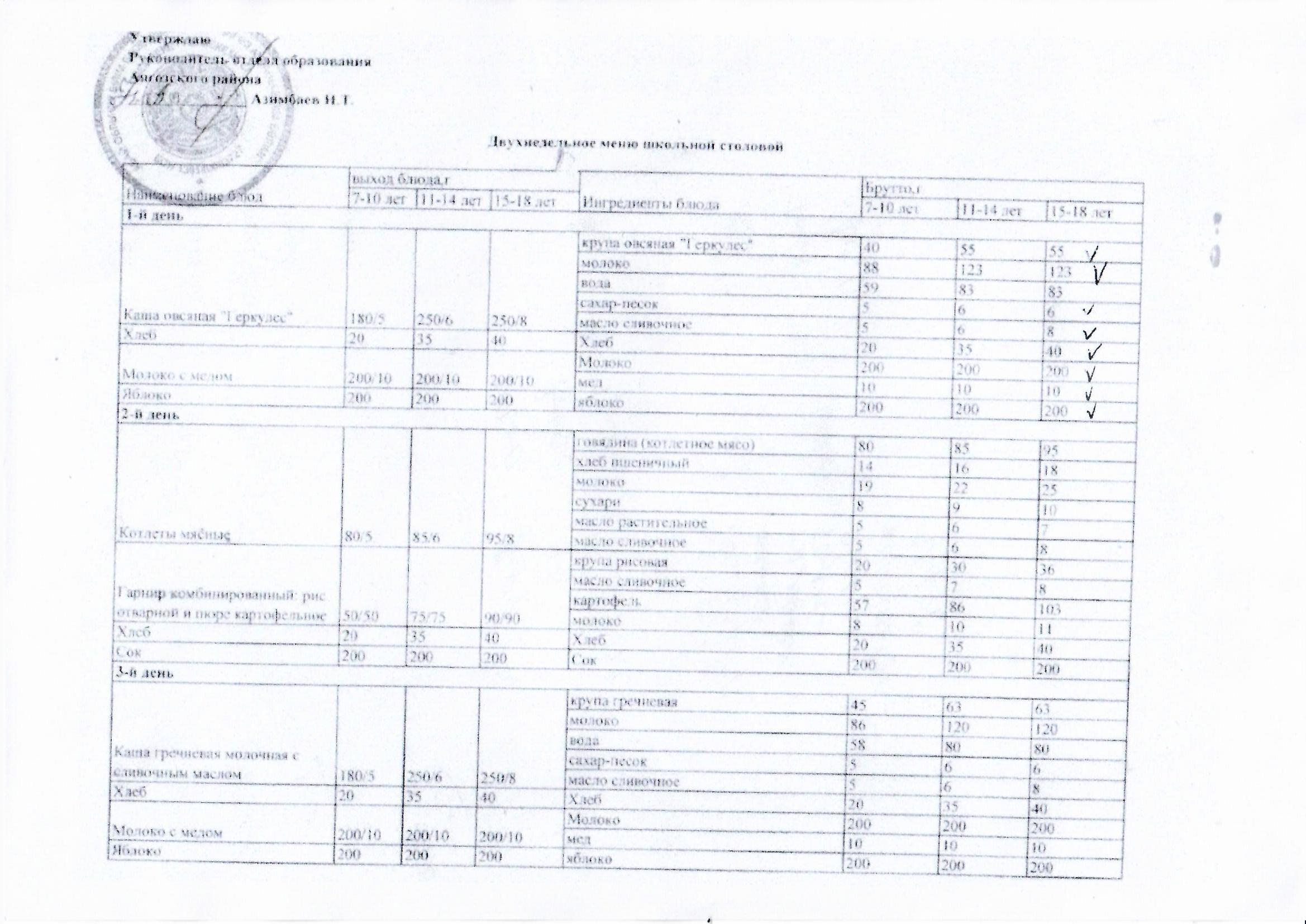 » Мектеп асханасының 2 апталық ас мәзірі