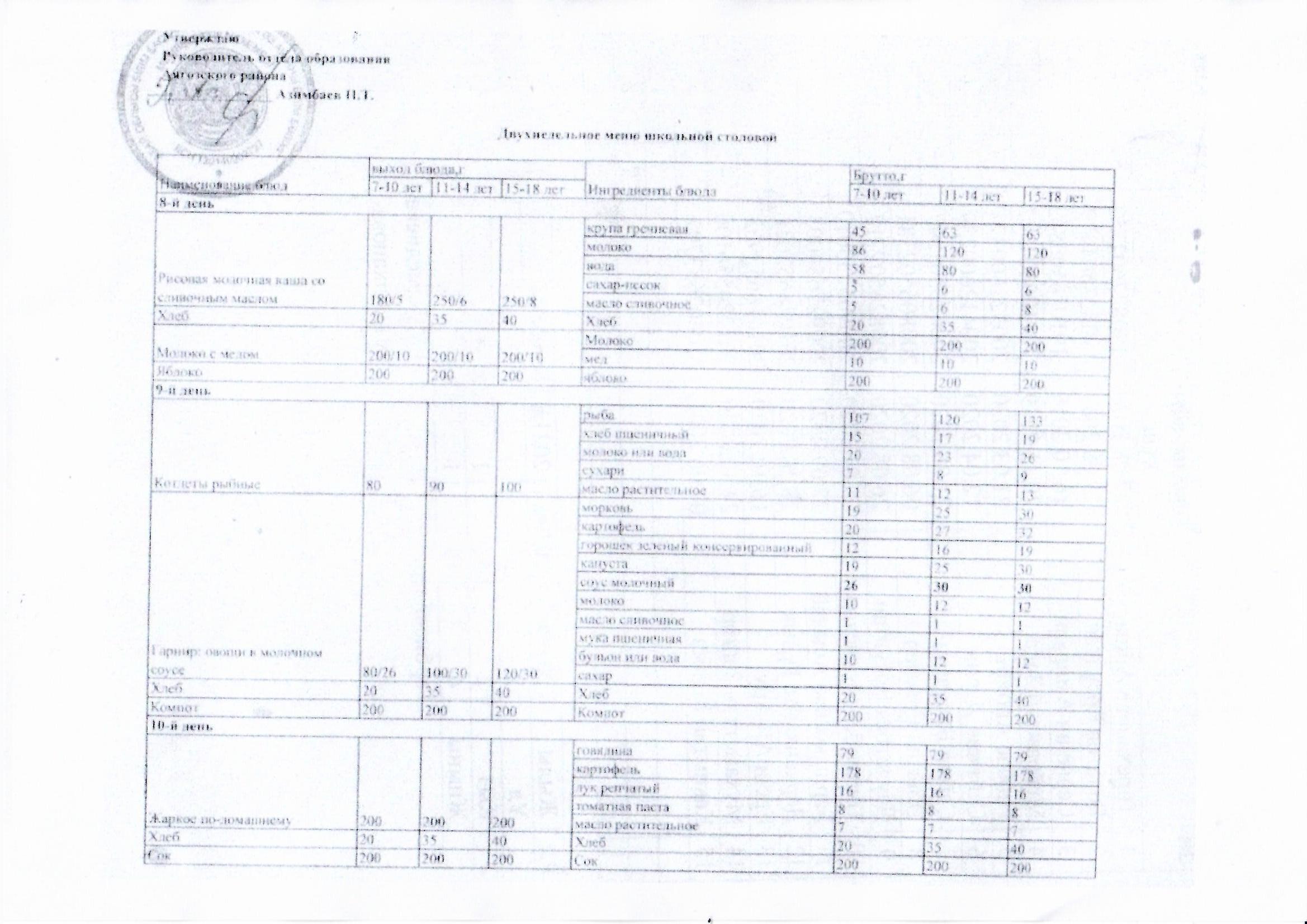 Мектеп асханасының 2 апталық ас мәзірі