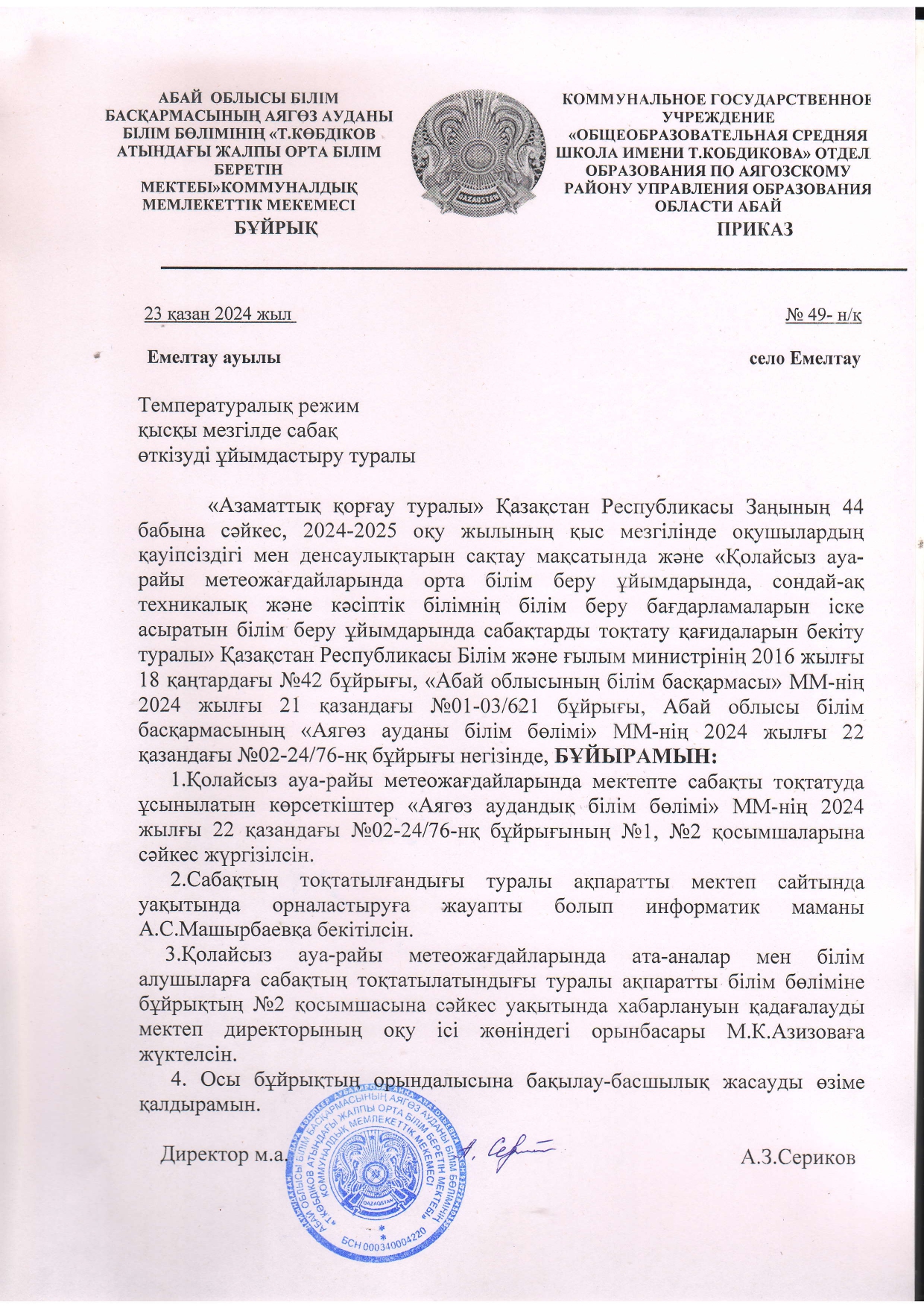 "Т.Көбдіков атындағы ЖОББМ" - ауа -райы туралы бұйрығы